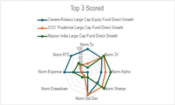 The radar chart above visually summarizes the performance of the top three large-cap funds — Canara Robeco, ICICI Prudential, and Nippon India across all the eight critical, normalized metrics. Each axis represents a key performance indicator (like 5-year returns, alpha, Sharpe ratio, expense ratio, etc.), scaled from 0 to 100. A broader coverage on the radar means stronger, more well-rounded performance.