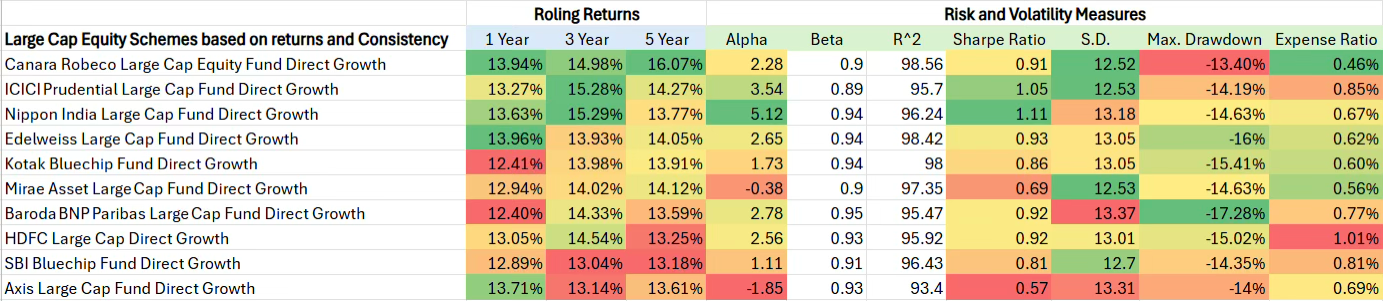 Canara Robeco stood out as the best overall. It gave the highest 5-year returns, stayed consistent over time, had the lowest costs, and protected well during market downturns. Nippon India also performed well with the highest alpha and Sharpe ratio, meaning it delivered strong returns for the risk taken — but it was a bit more volatile. ICICI Prudential and Edelweiss gave good returns too, while keeping risks and costs under control. Kotak Bluechip and Baroda BNP Paribas were average — decent performers but with some downsides like higher losses during market dips or average risk-adjusted returns. On the weaker side, SBI Bluechip and HDFC Large Cap were just okay across most areas. They had higher costs and didn’t really shine in any metric. Mirae Asset, despite being popular, had disappointing numbers with negative alpha and a low Sharpe ratio. Axis Large Cap ranked the lowest. It had the worst alpha, poor returns for the risk taken, and the highest ups and downs — making it a weak choice based on current data. Edelweiss, on the other hand, stood out for its low cost and strong ability to protect capital during tough times.