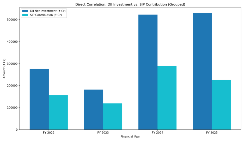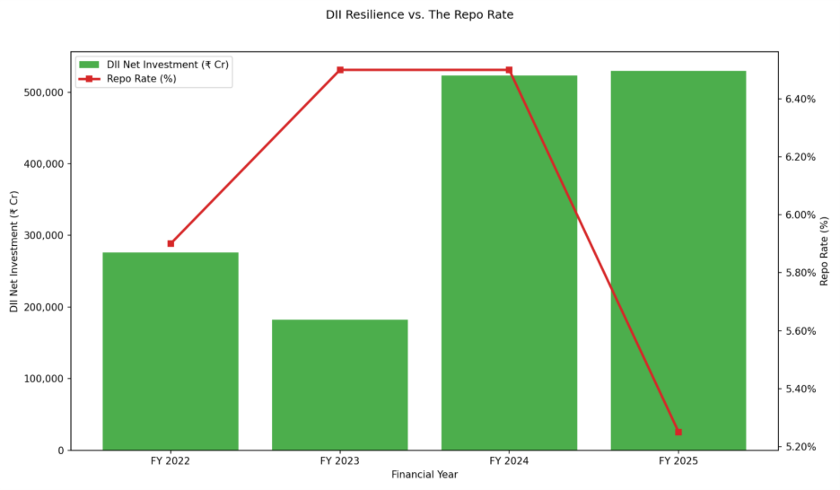 But there is an unexpected fact. Massive domestic institutional investor (DII) inflows began speeding up in 2024 before any rate cuts were announced. While global markets were pricing in extended monetary tightness, Indian mutual fund managers, insurance companies, and pension funds were already deploying capital at record levels into Indian equities. The RBI hadn't signaled cuts. The headlines were still dominated by inflation concerns.