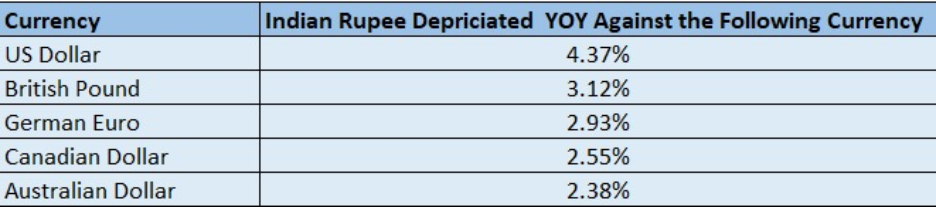 The table highlights the year-on-year depreciation of the Indian Rupee against major global currencies. The steepest decline is seen against the US Dollar at 4.37%, indicating strong pressure from global dollar strength. Depreciation against the British Pound and the Euro remains moderate at just over 3% and 2.9% respectively. Among the listed currencies, the Rupee weakened the least against the Australian Dollar, reflecting relatively better stability in that exchange rate.