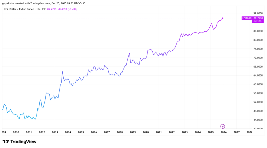 The graph highlights a clear long-term weakening of the rupee against the US dollar. The exchange rate has moved from around ₹45 per dollar in 2010 to nearly ₹90 per dollar in 2025, showing a steady upward trend over time. Although there are short phases of stability and minor pullbacks, the overall pattern reflects a consistent and gradual depreciation of the rupee, with each period of consolidation followed by a move to a higher level.