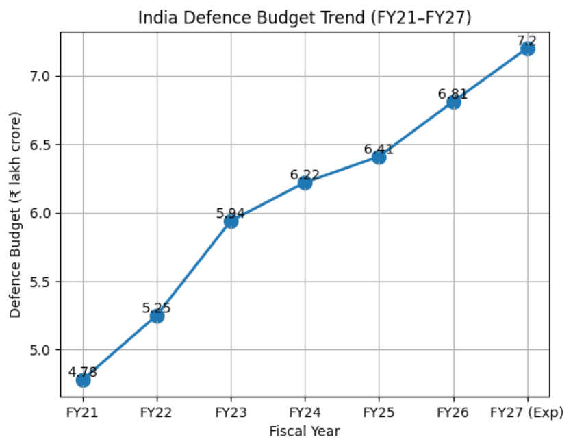 For the past few years, you may have noticed that right before the budget, defence stocks start rising sharply. Why is this so? India spends around 2.23%, which is roughly USD 93 billion. Over the last five years, India’s defence budget has followed an upward trajectory. Spending rose from ₹4.78 lakh crore in FY21 to ₹6.81 lakh crore in FY26 and is expected to cross ₹7 lakh crore in FY27, with a growth rate of nearly 7%.